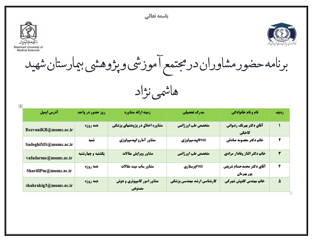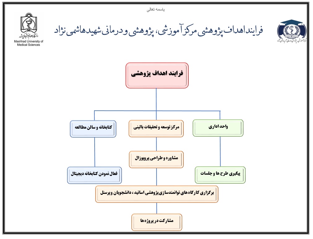 معاونت پژوهشی مرکز آموزشی ، پژوهشی و درمانی شهید هاشمی نژاد با هدف تولید، توسعه و ارتقای دانش و فناوری در عرصه سلامت با اجراي طرحها و پروژه های تحقیقاتی متعدد و با بهره گیری از اعضای هیئت علمی ، پزشکان متخصص و فوق تخصص و کارشناسان توانمند در حال فعالیت است. ما مصمم هستیم با توانمندسازی دانش پژوهان ضمن حفظ ارزش های اخلاق در پژوهش، بستر مناسبی را جهت ارتقاء سطح کیفی و کمی پژوهش های بالینی فراهم آوریم.هدف ما نهادینه شدن نگرش پژوهشی در بخشهای بالینی است..لطفا با انتقادات و پیشنهادات سازنده خود ما را جهت ارتقا هرچه بیشتر این امر یاری نمایید.
