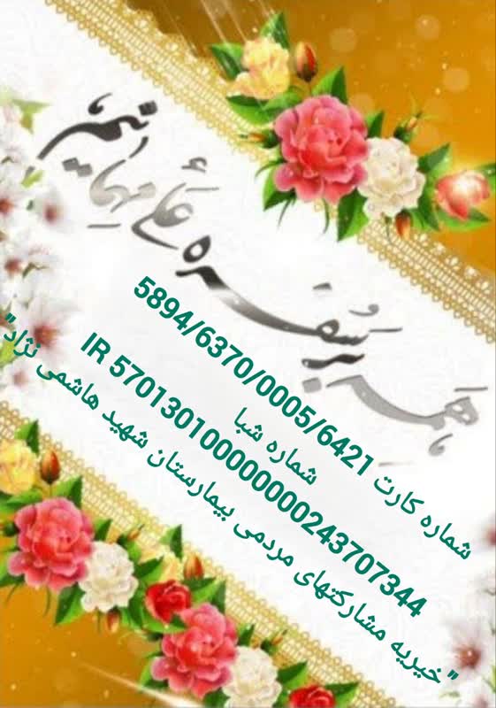 شماره کارت 5894/6370/0005/6421 IR شماره شبا 570130100000000243707344 "خیریه مشارکتهای مردمی بیمارستان شهید هاشمی نژاد"