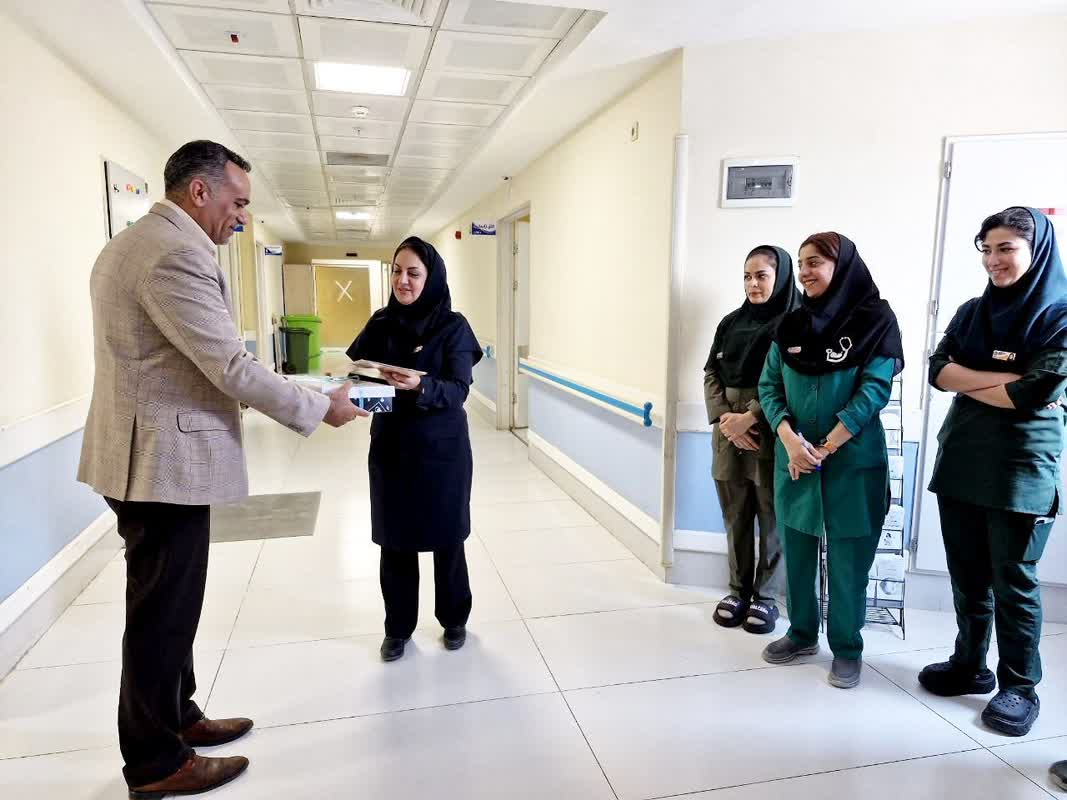 رئیس محترم بيمارستان آقای دکتر ابراهیمی پور با همراهی تیم مدیریتی مرکز و دفتر خدمات پرستاری، با حضور در بخش زایشگاه ضمن عرض تبريك به پرسنل پر تلاش این بخش، کسب رتبه برتر در اجرای ترویج زایمان طبیعی و کاهش شاخص سزارین نخست در سطح استان و دانشگاه علوم پزشکی را تبريك گفتند و از اساتید ، پزشکان و پرسنل این بخش تشکر و قدردانی گردید. همچنین از زحمات سرکار خانم طیبی ماما مسئول بخش زایشگاه با اهدای لوح تقدیر تشکر شد.