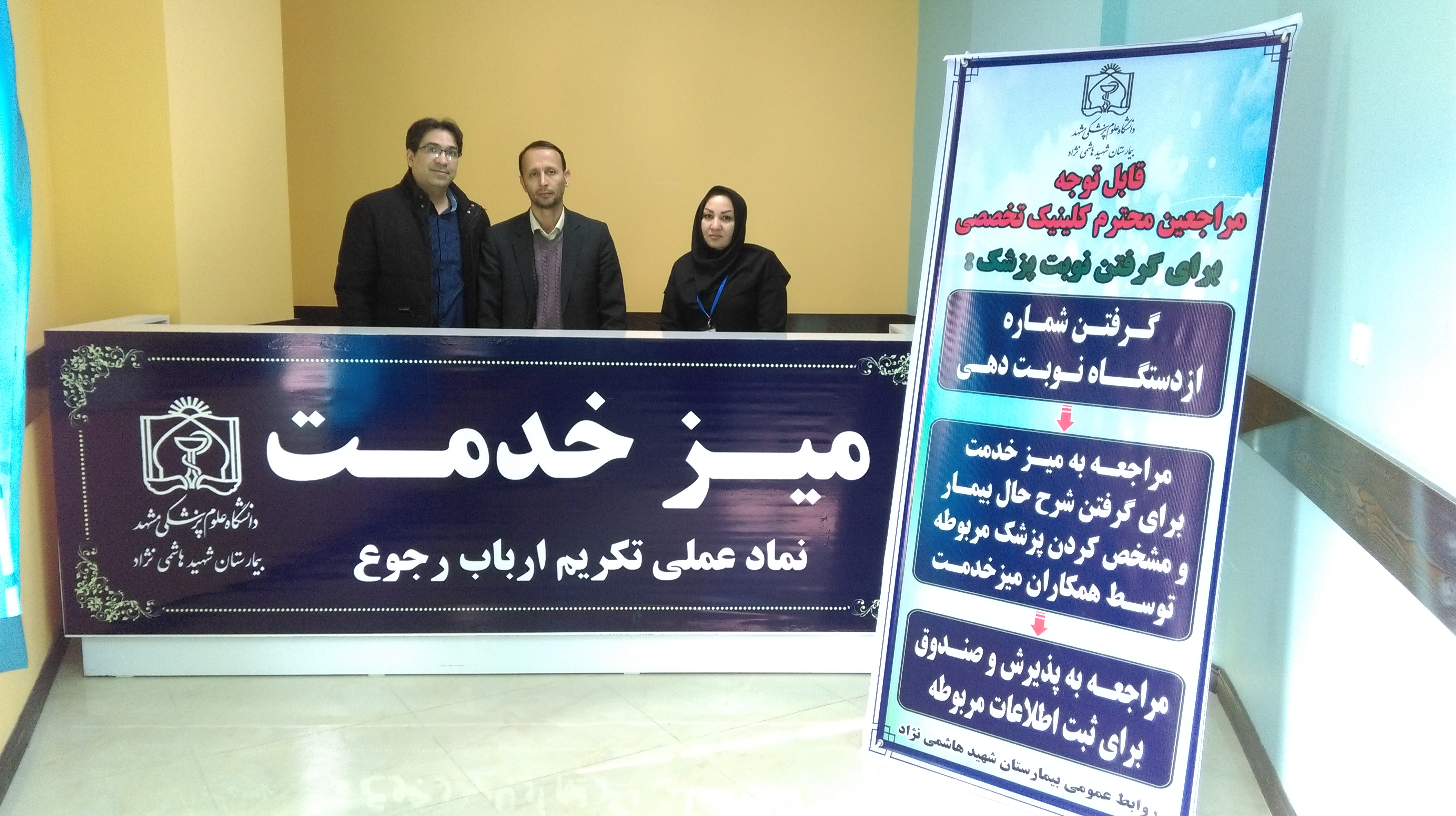 در طی این بازدید مورخه سه شنبه 29/8/97 که با حضور آقای دکتر علی شعیبی معاون آموزش پزشکی عمومی دانشکده پزشکی و آقای دکتر هاشمی ریاست اداره آموزش دانشکده پزشکی و خانم دکتر شبنم نیرومند مدیر EDO دانشکده پزشکی و آقای دکتر مجید صدرزاده معاون آموزشی و پژوهشی بیمارستان شهید هاشمی نژاد و مسئول دوره کلینیک سرپایی تروماتولوژی دانشکده پزشکی از فرایند میز خدمت در کلینیک تخصصی بازدید بعمل آمد.
